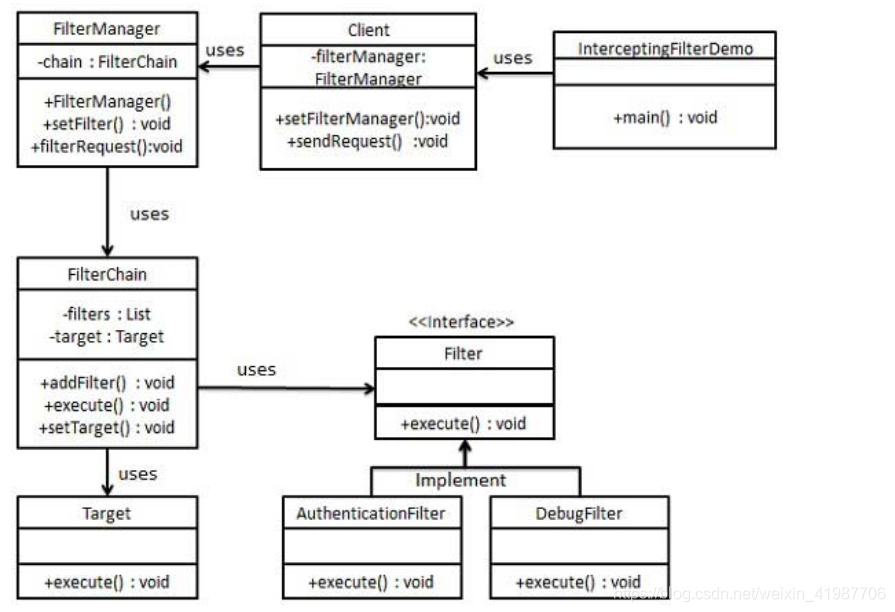 我们将创建 FilterChain、FilterManager、Target、Client 作为表示实体的各种对象。AuthenticationFilter 和 DebugFilter 表示实体过滤器。
